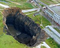 Разрастается он день ото дня. По прогнозам специалистов, верхняя часть провала к концу года достигнет диаметра 200 метров и вплотную подберется к жилым постройкам и действующей ветке железной дороги.