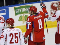 Вчера сборная России завершила свой предварительный этап чемпионата мира по хоккею уверенной победой над Данией со счетом 4:1. Россияне играли мощно и уверенно, нанеся по воротам противника 43 броска, голевыми стали попытки Максима Афиногенова, Александра Овечкина, Сергея Федорова и Константина Горовикова. С тремя победами сборная России заняла первое место в группе D.
