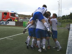 | Футболисты молодежной сборной Фарерских островов празднуют забитый в ворота сборной России гол |